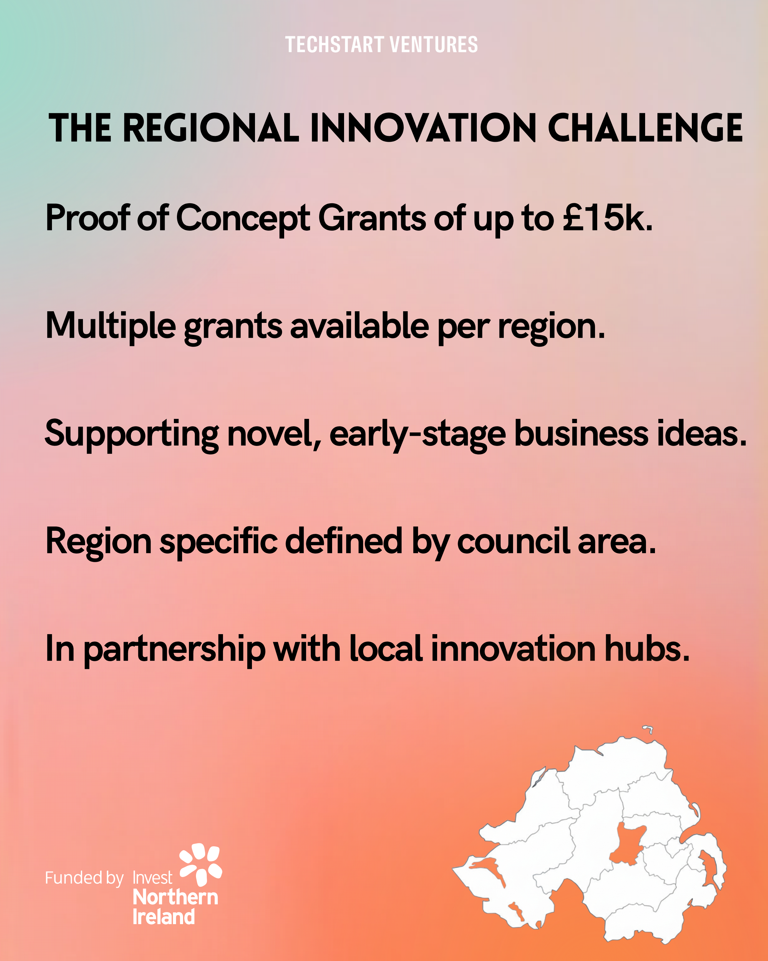 Techstart Ventures invites entrepreneurs with innovative business ideas to apply to the Regional Innovation Challenge, a Northern Ireland–wide grant competition designed to support founders at the earliest stage of development.